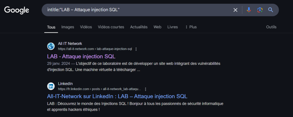 Trouver une page contenant « LAB – Attaque injection SQL ». Je connais évidemment le nom exact de mon article dans cet exemple :intitle:"LAB – Attaque injection SQL"